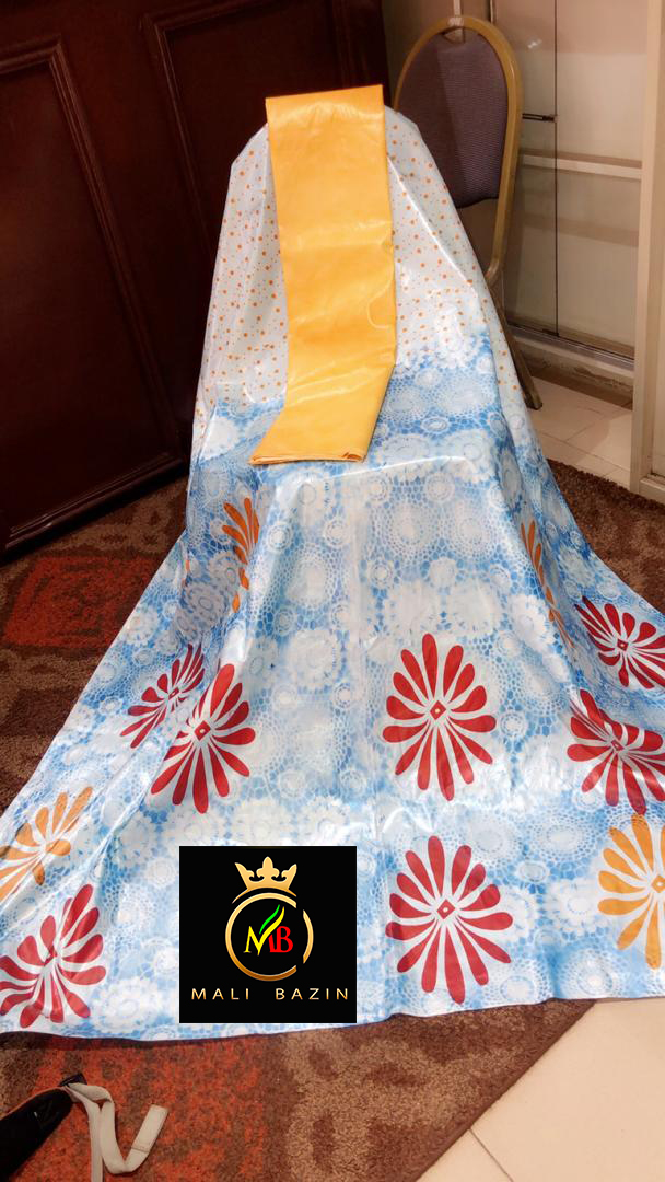 Découvrez en exclusivité ce Bazin Riche tMotif Bleu Baga ornée en Jaune Or et rouge Sang en 3metres, 4metres et 5mètres 6mètres idéal pour faire des tenues pour les grand évènements chic et classe vous ne jamais pas passer inaperçu.