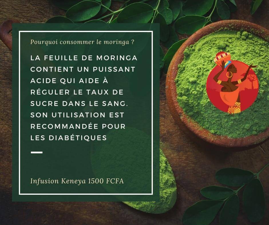 Les bienfaits de keneya :contient du moringa ou appelé l’arbre de vie ou encore super food lutte contre plusieurs maladies comme réguler la tension artérielle, stabilise le taux de sucre dans le sang, lutte contre la malnutrition, un super médicament .