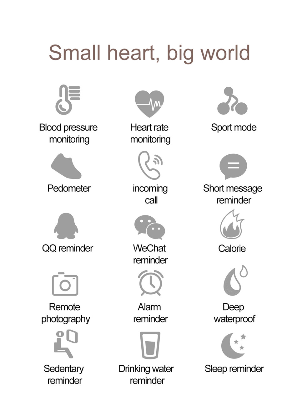 Fréquence cardiaque; surveillance du sommeil; étanche; exercice WeChat; alarme intelligente; longue séance; message;