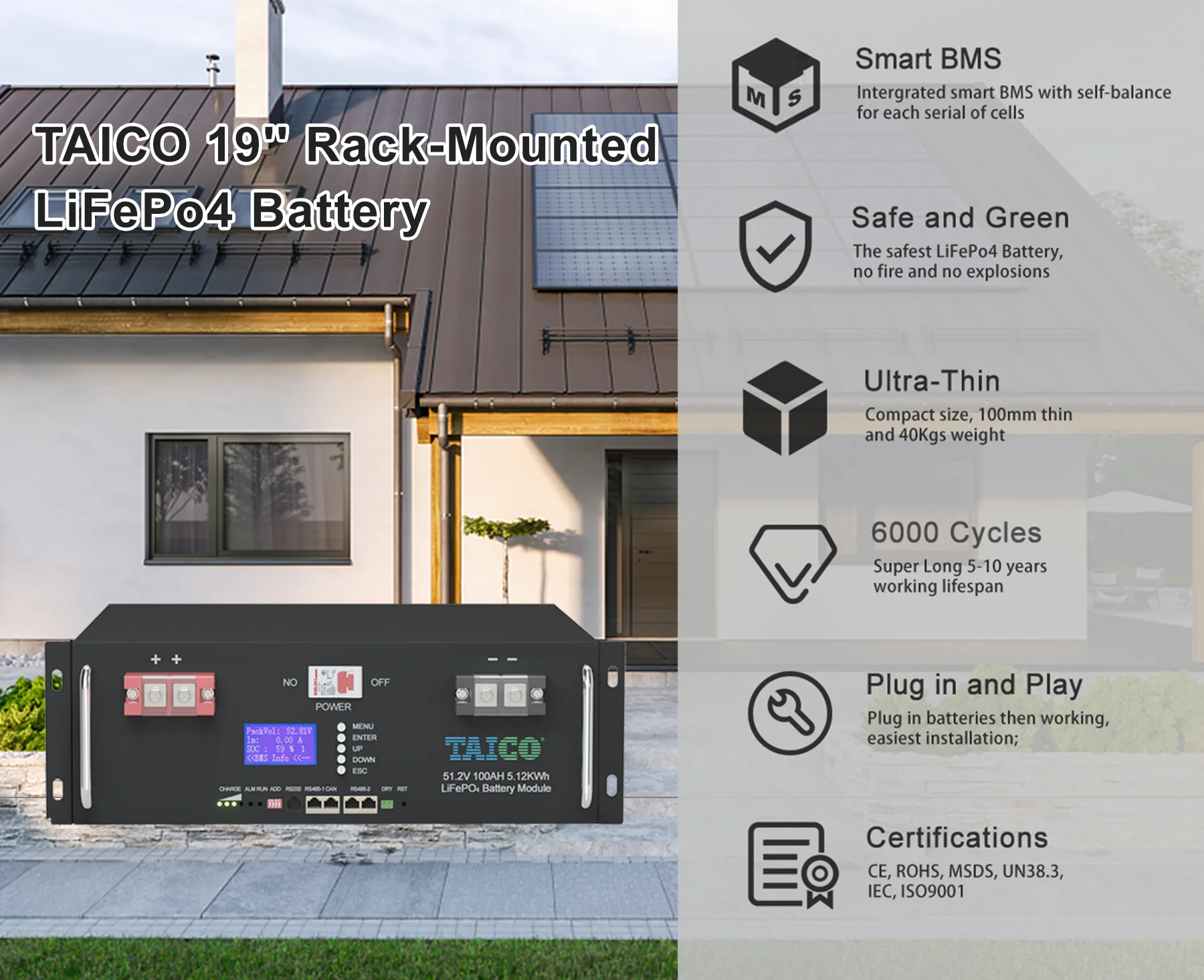 Ikasougou vous propose la batterie lithium Taico 51.2V 100Ah, une solution solaire performante et durable pour garantir l’alimentation continue de votre foyer, même en cas de coupure de courant.